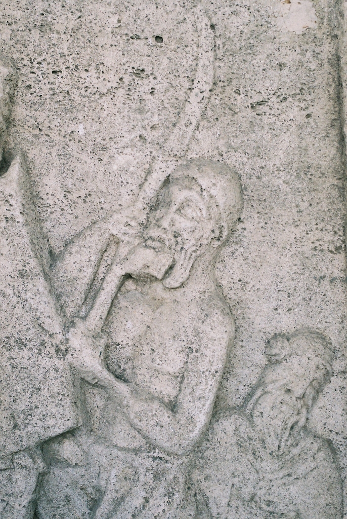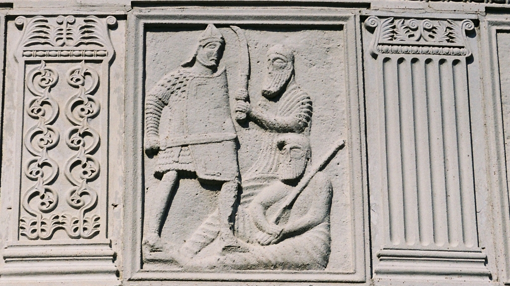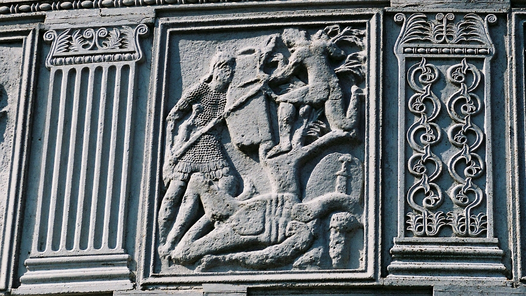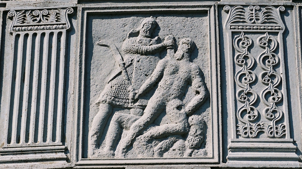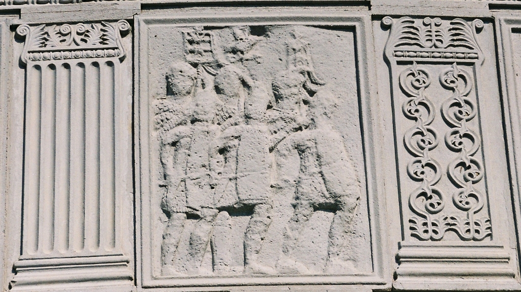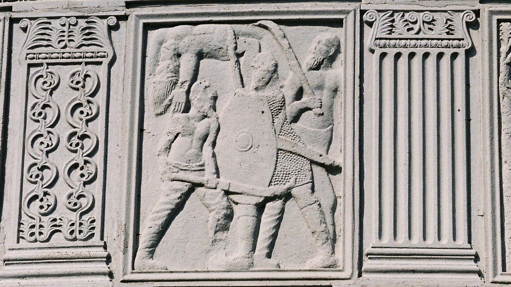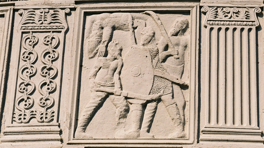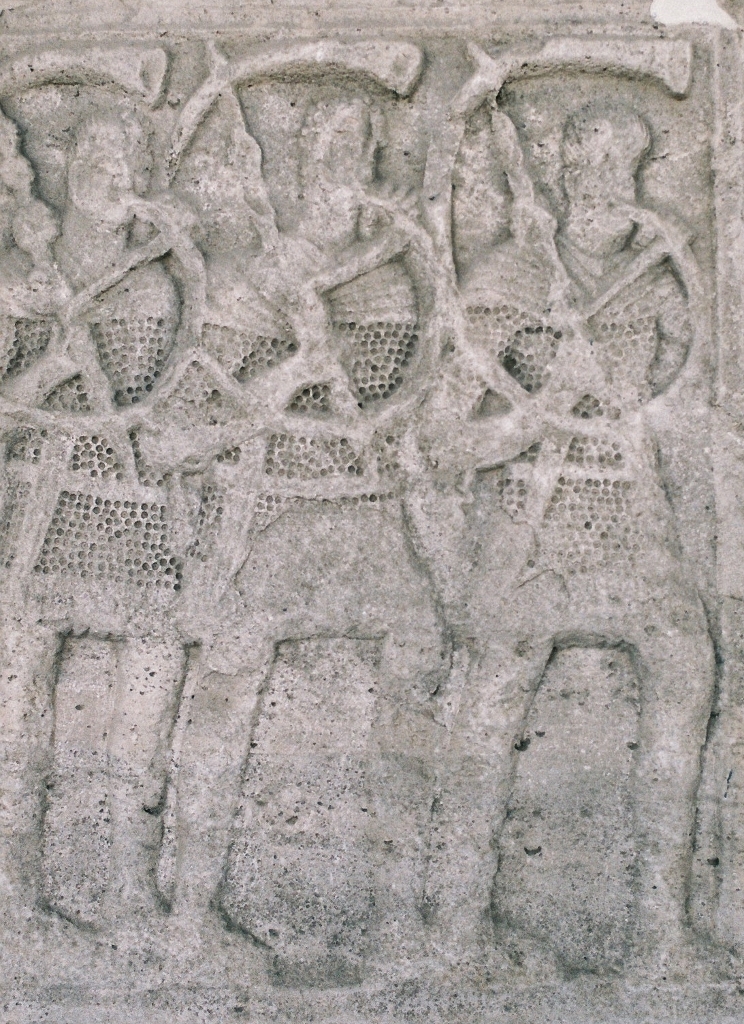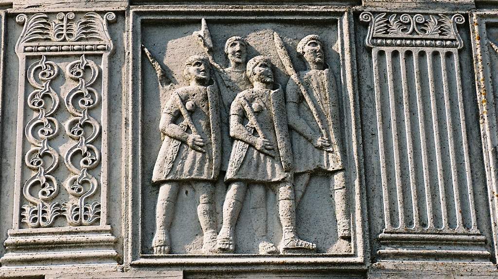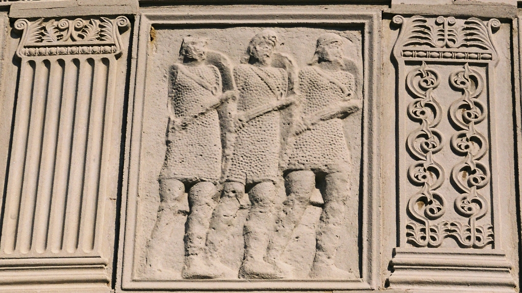 Les métopes racontent les principaux épisodes de cette confrontation, nous pourrions y distinguer une quarantaine de Bures qui combattent comme les Daces avec des Falx, une vingtaine de Daces et quatre Sarmates en Kaftan.